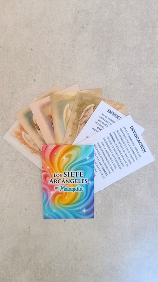 🃏 7 Cartas principales plastificadas, súper resistentes, de 8 x 12 cm, con la imagen de cada Arcángel.